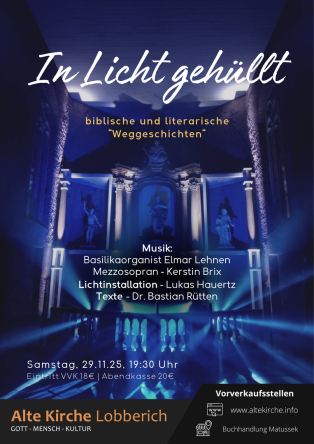 Als Auftakt für unser Event „Emotions of light” laden wir an diesem Abend zu einem besonderen Konzert für alle Sinne ein. Die Illumination von Lukas Hauertz agiert an diesem Abend mit der Musik von Basilikaorganist Elmar Lehnen (Flügel), Kerstin Brix (Gesang) und Bastian Rütten (Texte). Alle Akteure agieren an diesem Abend improvisierend. Es gibt kein Drehbuch. Der gesamte Abend entwickelt sich aus dem Agieren aller Künstler. Ein spannendes Projekt, das sich in diesem Jahr mit biblischen und literarischen „Wegge-schichten” beschäftigt.