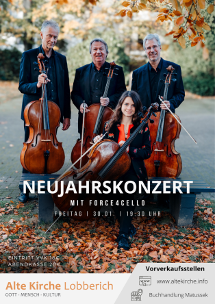 Auch in diesem Jahr laden wir zu einem festlichen Neujahrskonzert in die Alte Kirche ein. Zu Gast ist das renommierte Cello-Quartett „Force4Cello“, das seit vielen Jahren auf internationalen Bühnen zu Hause ist. Wer meint, Cellomusik sei schwermütig und trist, darf sich gerne vom Gegenteil überzeugen. Unter dem Motto „16 Saiten in Hochform“ erwartet das Publikum eine abwechslungsreiche musikalische Darbietung, die von Meisterwerken der Klassik bis hin zu schwungvollen Pop-Arrangements reicht.