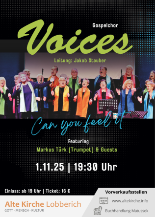 An diesem Abend begrüßen wir den Gospelchor Voices aus Wachtendonk und Umgebung in der Alten Kirche und freuen uns auf frisch inspirierte Chor-Arrangements, die direkt in die Ohren, Herzen und Beine gehen.