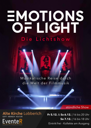 Auch in diesem Jahr verwandelt sich die Alte Kirche Lobberich zum Adventsmarkt in einen Ort voller Magie. „Emotions of Light“ nimmt euch mit auf eine rund 20-minütige Reise durch die faszinierende Welt der Filmmusik – von sanften Klängen über mitreißende Melodien bis hin zu echter Gänsehaut-Musik. Begleitet wird diese musikalische Reise von einer großen Lichtshow, die die Musik mit Licht inszeniert – ein Erlebnis für alle Sinne. Freut euch auf musikalische Highlights aus Star Wars, Oppenheimer, La La Land und vielen mehr!